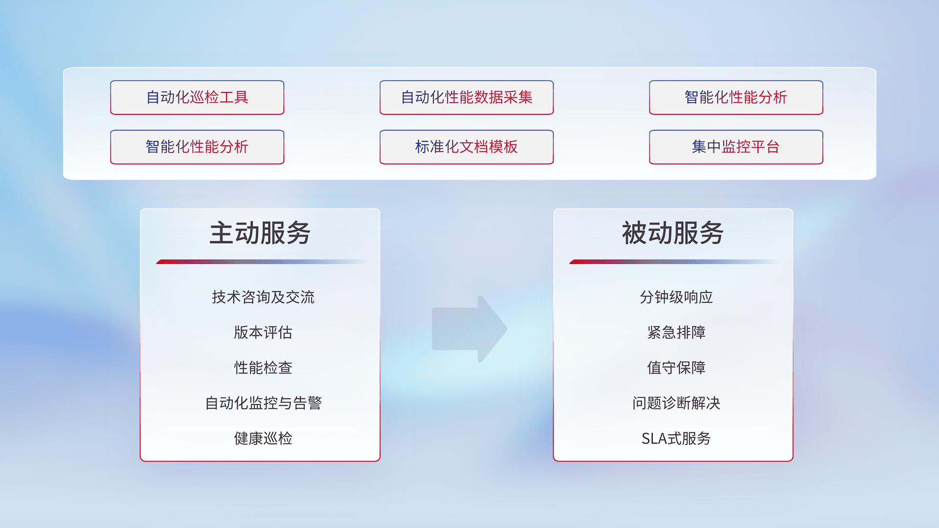 智能化工具和标准化文档,,保障服务质量,,,提供主动服务(包含技术咨询、、、、版本评估、、、性能检查、、、自动化监控与告警、、、、健康巡检)和被动服务包含(分钟级响应、、紧急排障、、、、值守保障、、问题诊断解决、、、、SLA服务)。。。